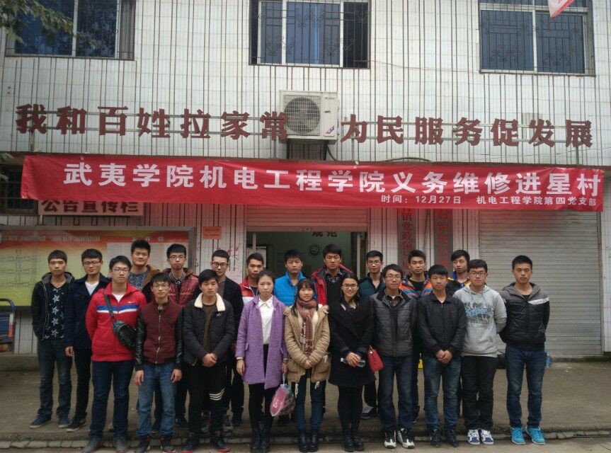2015年12月27日,武夷学院机电工程学院第四党支部的学生党员们与大四辅导员黄丽娜老师带着为人民服务之心,来到了武夷山星村镇为大家无偿维修各种各样的家用小电器。此次活动得到了院领导和星村镇政府领导的大力支持,与此同时,同学们在这次的“义务维修进星村”的活动前也做了充足的准备。