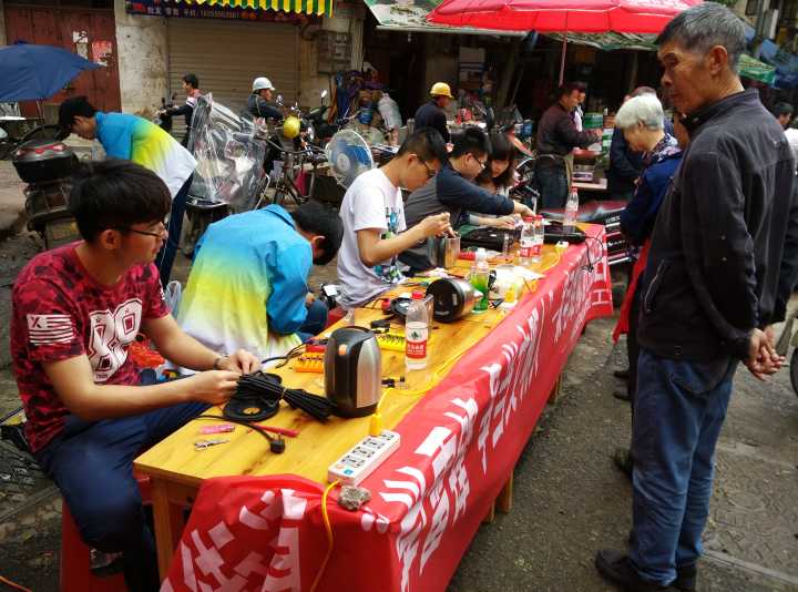 4月27日上午,机电工程学院学生党员志愿者服务队走进崇安街道花桥社区开展小家电义务维修校村居共建活动。