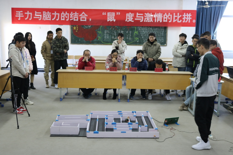 此次比赛在实践部主持人的主持下正式开始。首先,由裁判宣读裁判规则。接着,就是各个队伍真枪实弹的比拼。队伍负责人按照顺序依次上场,只见大家的电脑鼠都插满线管,有些还用了灯泡装饰,走起来虎虎生威。电脑鼠上场了,没有出人意料的速度,但是每一个拐角,就像遥控装置一般,旋转自如。一时间,大家都屏住了呼吸,电脑鼠在迷宫中穿梭,有时也会走进死胡同,最终却都能走出来,近了近了,离出口近了。在穿过出口的一刹那,负责人松了一口气,整个房间响起了此起彼伏的掌声。