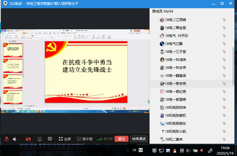 2020年5月19日晚上7点,机电工程学院第67期入党积极分子培训班开班,学院党委书记龚建金、院组织员熊华萍、62名入党积极分子参加了此次开班典礼。
