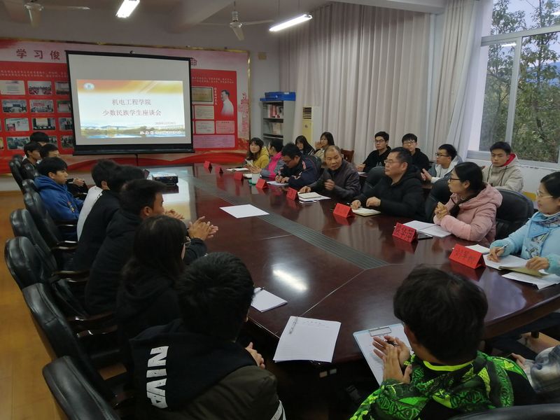 为进一步关心学院少数民族学生的学习、生活,帮助少数民族学生成长成才,12月29日下午,机电工程学院在瑞5#301会议室召开少数民族学生座谈会。学院党委书记龚建金、副书记邹义煜、学院副院长潘应晖、学院党委统战委员、学工科科长罗凌燕及辅导员代表、少数民族学生参加了座谈会。