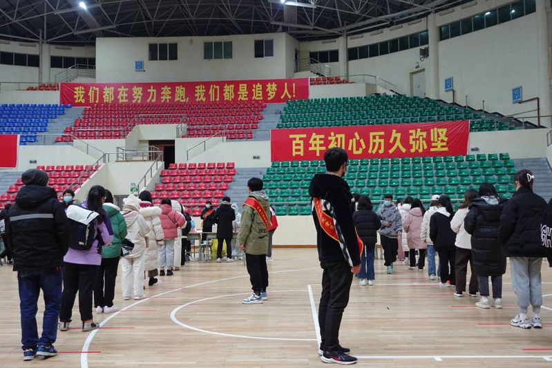 同学们在体育馆西大门侧的帐篷内排队,从西大门有序进入体育馆内参加核酸检测。“同学们,请隔位就座,有序进场”“同学,请戴好口罩,排好队”“同学,请保持一米间距,站在一米线上”……这是不断回响在体育馆上空的声音。场中佩戴着机电工程学院党员志愿者绶带的党员志愿者们正在热情地引导同学们有序参与,做到了通道不拥挤,学生不聚集。