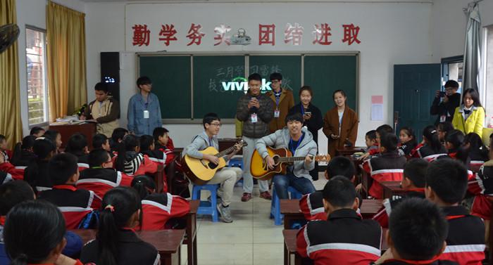 校艺术团走进武夷山进修附小为进一步弘扬志愿者精神,增强同学们的志愿服务意识,展现我校大学生艺术团的风采,2016年3月17日下午,我校大学生艺术团30余人走进武夷山进修附小,开展“大手牵小手,绘画七彩人生”志愿服务活动,为那里的留守儿童们上了一堂生动活泼的“七彩课堂”。 此次活动的对象是该校五年级的学生,由艺术团的EXT街舞队、民舞队、UD乐队以及合唱队进行现场教学指导。艺术团的成员在课上播放趣味性的ppt内容、表演炫酷的节目以及与孩子们互动做游戏,让孩子们获益匪浅,并从中学到了知识和表演技能,同时引导孩子们建立正确的人生观和价值观,让他们能够和同龄孩子一样健康快乐地成长。 此次活动是我校大学生艺术团践行社会主义核心价值观,积极响应校团委号召开展的“三月雷锋月”志愿服务项目。今后,我校大学生艺术团将不断探索创新,并逐步拓展更多服务于乡镇学校的大学生志愿服务实践基地,为艺术教育的普及贡献力量。