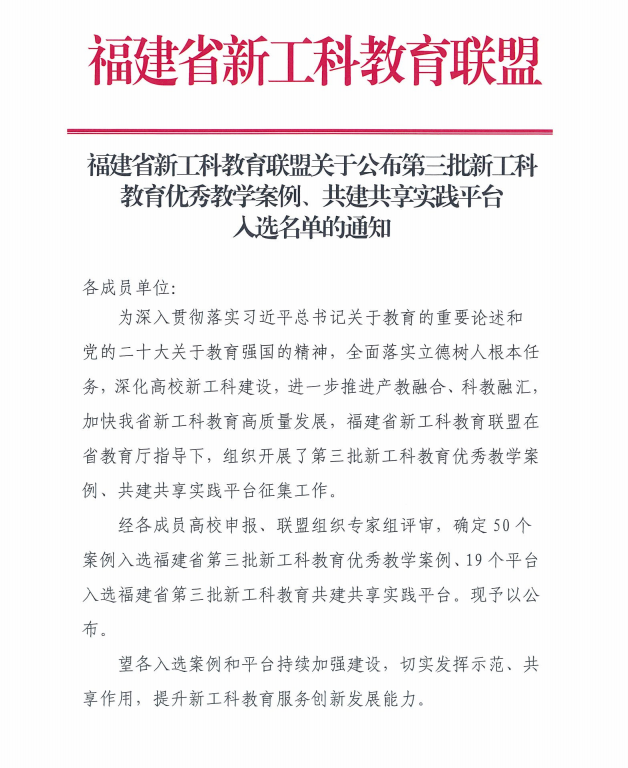 近日,福建省新工科教育联盟公布第三批新工科教育优秀教学案例、共建共享实践平台入选名单,我校2项成果成功入选。其中,“铸良心食品,育匠心人才——新工科理念下《食品专业创新实验》创新育人教学案例”(项目负责人:傅新征)入选新工科优秀教学案例;“智能控制新工科共建共享实践平台”(项目负责人:郭波)入选新工科共建共享实践平台。此次入选,是对学校新工科建设成效的肯定,将进一步推动学校人才培养与实践平台建设提质增效。