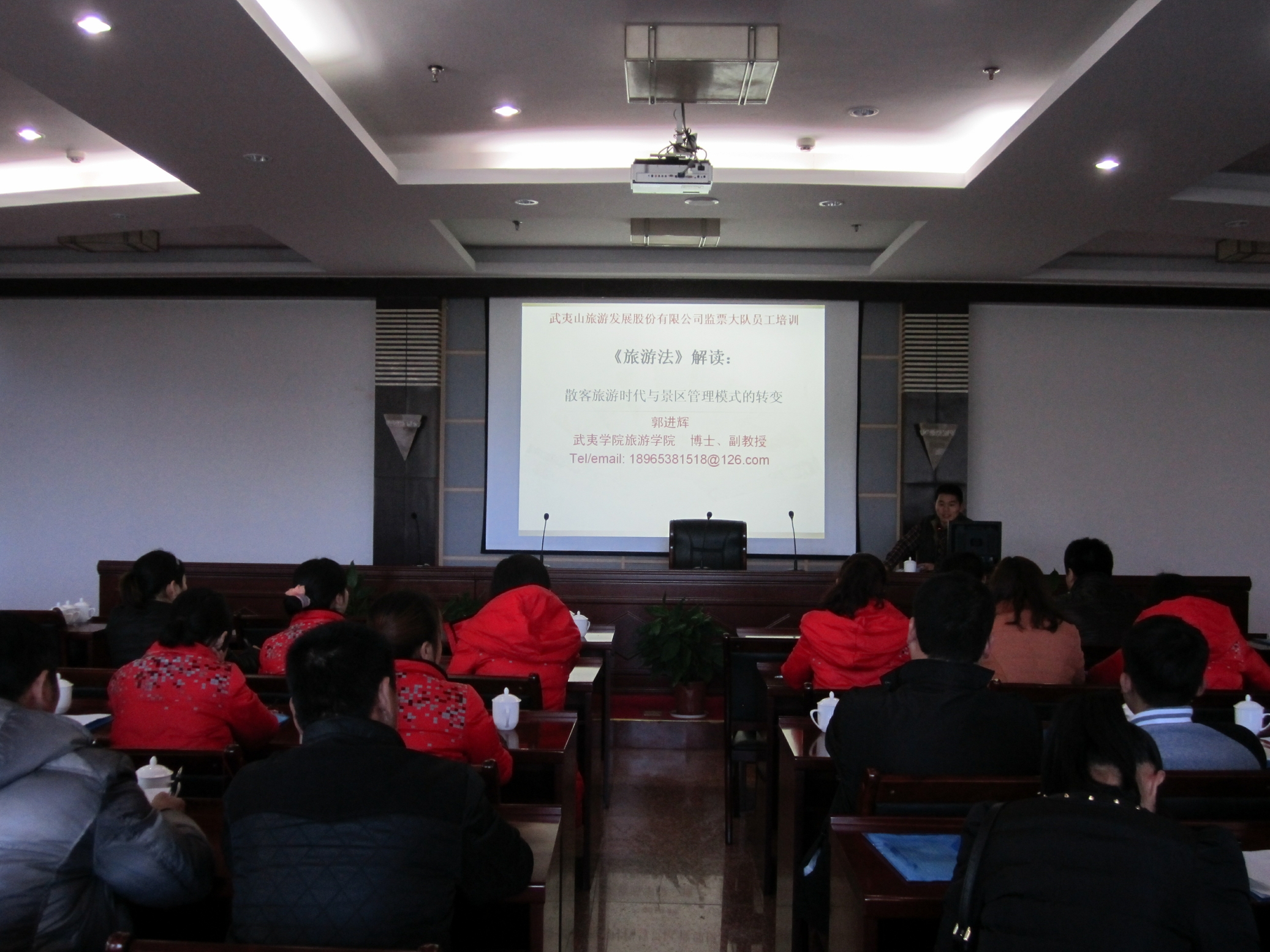 为了深入贯彻学习《旅游法》,武夷山旅游发展股份有限公司监票大队于2014年3月9日下午邀请武夷学院旅游学院郭进辉博士开设题为《散客旅游时代与景区管理模式的转变》专题讲座。郭进辉博士分析了《旅游法》对旅游景区管理的影响,提出了“散客”时代景区管理面临的新压力,介绍了国内外景区管理的先进经验,从旅游购票服务、监票服务、排队管理、安全管理等角度建议景区逐步转变游客管理模式,提升武夷山国家级AAAAA级旅游景区管理水平。