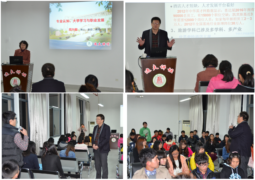 | 3月13日晚,我校旅游学院院长郑向敏教授、博导在图书馆“逸夫讲坛”为读者做了题为“专业认知、大学学习与职业发展” 的精彩讲座。 郑教授从专业认知与大学学习、大学生学习与职业发展意识、大学生学习与职业生涯规划、大学生必须关注与思考的问题等角度,运用学习生活中的鲜活案例为大学生认知专业、端正学习态度与职业规划作了深入浅出的阐述。他结合旅游背景、酒店行业背景,说明了旅游学科已涉及多学科、多产业,并介绍了该专业的性质、特点。郑教授希望同学们明确努力方向,端正学习态度,在学习中创新;鼓励同学们尽早确定创业目标、注重综合素质的培养,要善学习,多思考,勤实践。 在学生互动环节,旅游管理、通信工程等学生就如何学好专业、大学生是否创业、大学期间是否考证、人生中重大转折点的选择、就业与考研的选择等问题纷纷提问,郑教授幽默风趣的解答令现场气氛热烈,掌声不断,整个讲座长达两个半小时。 图书馆徐俐华馆长主持讲座并做总结发言。她对郑向敏院长接受邀请到“逸夫讲坛”给读者演讲表示感谢,并介绍了郑教授在旅游管理、旅游安全、饭店管理、区域旅游经济等方面的教学与科研工作的突出地位。同时她也勉励同学们在大学阶段多到图书馆、多学习,规划好自己的职业生涯。 |