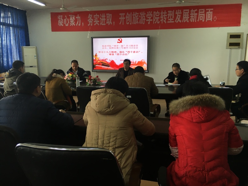 01月05日,旅游学院党委召开“两学一做”学习教育常态化、制度化第三专题学习讨论会,学习党的十九大精神,强化“四个意识”,增强“四个自信”。学习讨论会由旅游学院党委副书记祁少华主持,院党委委员、各支部书记、支部委员、及全体教职工党员参加了学习会。祁少华副书记和学生支部书记结合个人思想、工作、岗位实际,分别作了主题发言。