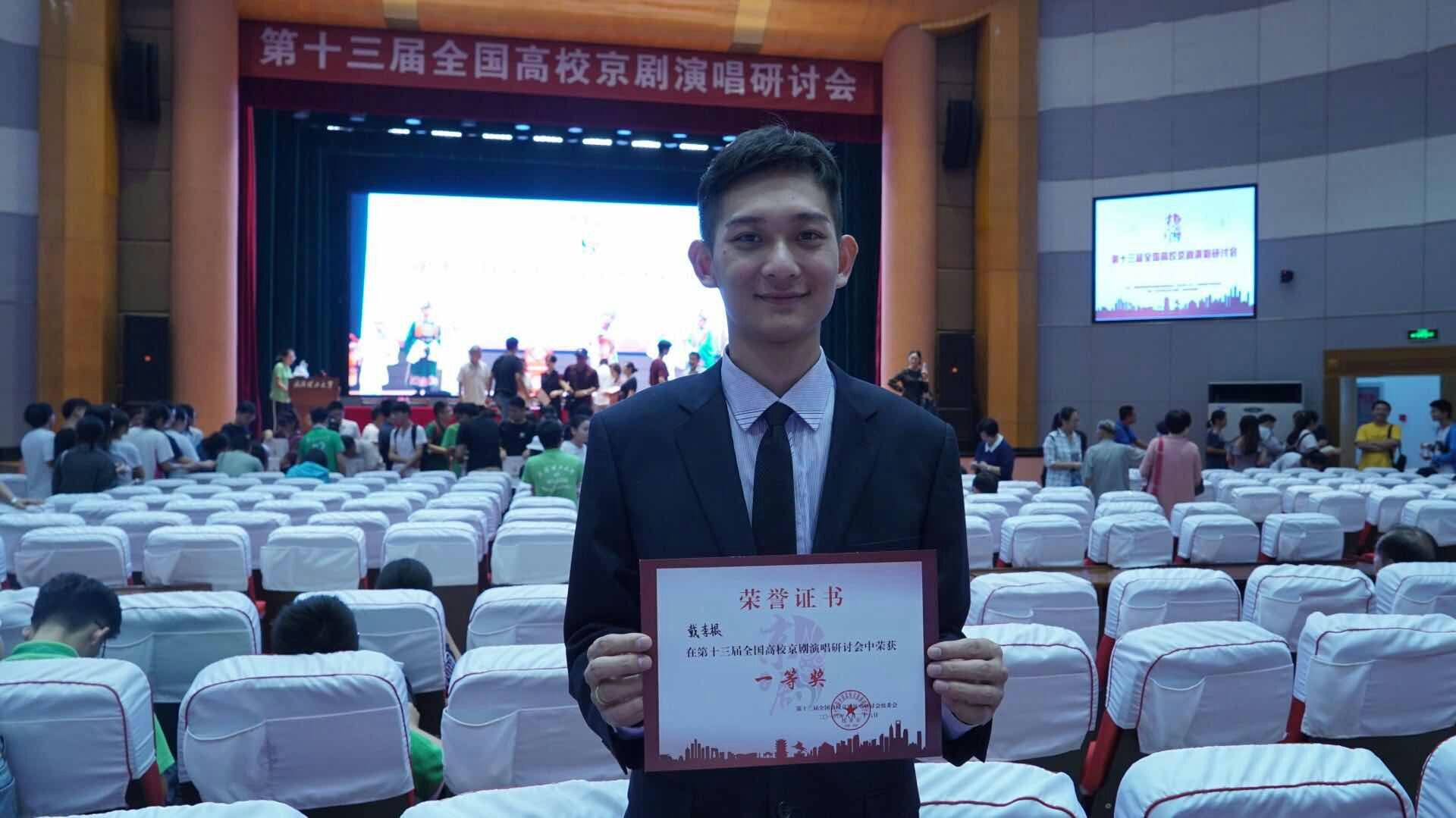 戴李根同学首次参加全国高校京剧演唱研讨会,也是我校首次参加此次演唱研讨会8月21日清唱的程(砚秋)派名剧《锁麟囊》选段“一霎时把前情俱已昧尽”,于众多参赛节目中脱颖而出,荣获国家一等奖,演唱水平得到专业评委一致认可,在大会闭幕式上,作为领奖代表上台领奖。