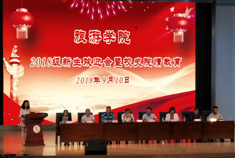 2018年9月10日上午,旅游学院在学生活动中心举行新生欢迎会暨校史院情教育讲座,出席会议的旅游学院的院长熊孝存、党委副书记祁少华、副院长纪丽芳、郭进辉、各系主任、优秀校友、及2018级辅导员和2018级全体新生,会议由旅游学院学工副科长林平先主持。