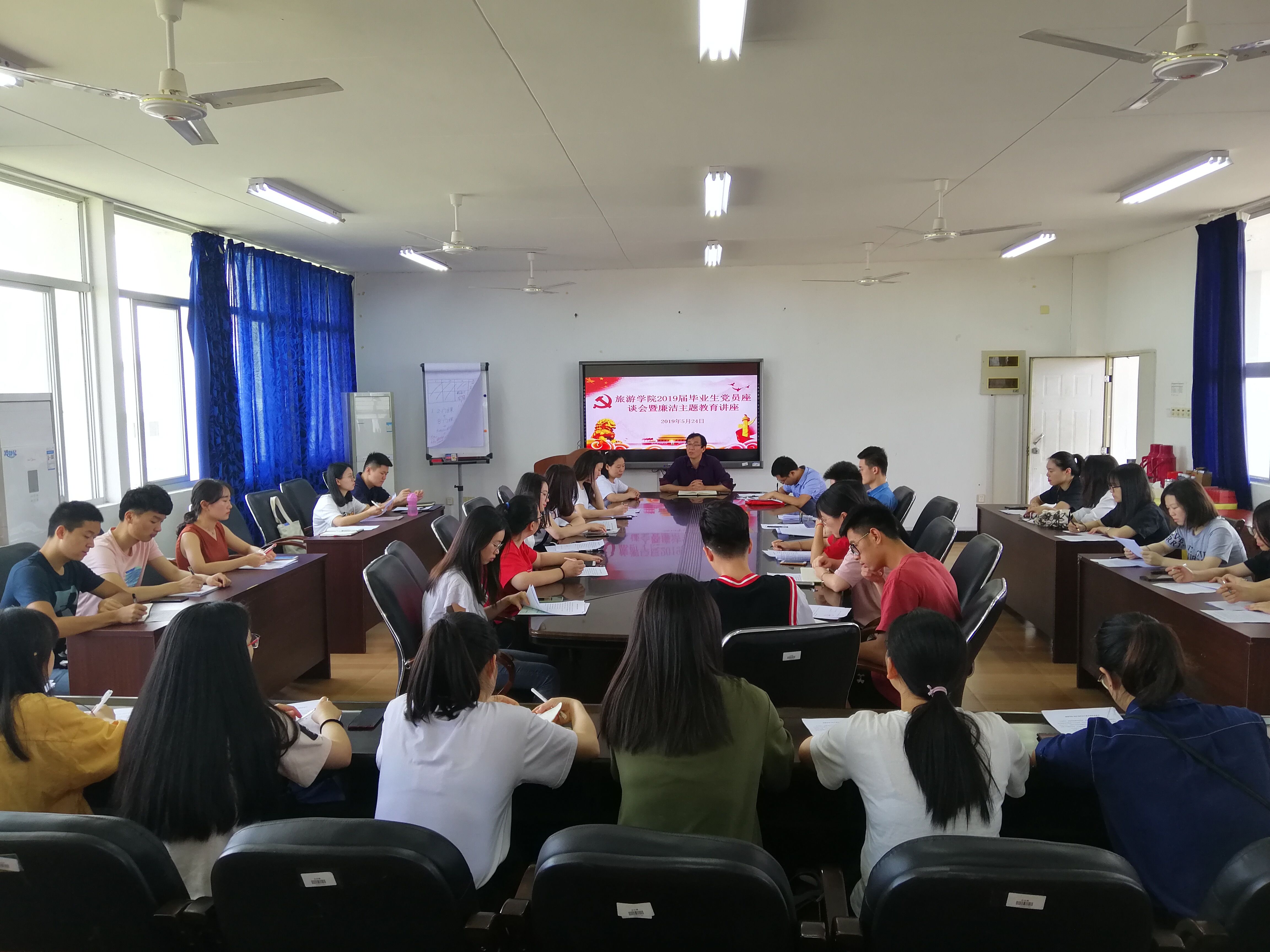 5月24日下午,旅游学院在瑞11五楼会议室举行2019届毕业生党员座谈会暨廉洁主题教育讲座。学院党委副书记、毕业班辅导员、组织员及全体毕业生党员参加了本次座谈会。会议由学院党委副书记祁少华主持。