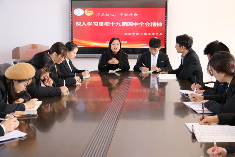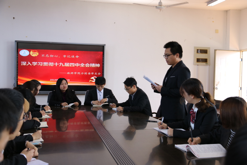 12月11日,分团委书记林丹丹老师在旅游学院五楼会议室宣讲党的十九届四中全会精神。会议由分团委学生会主席林江成主持,学生会主席团和所有部门部长代表近20人聆听宣讲。