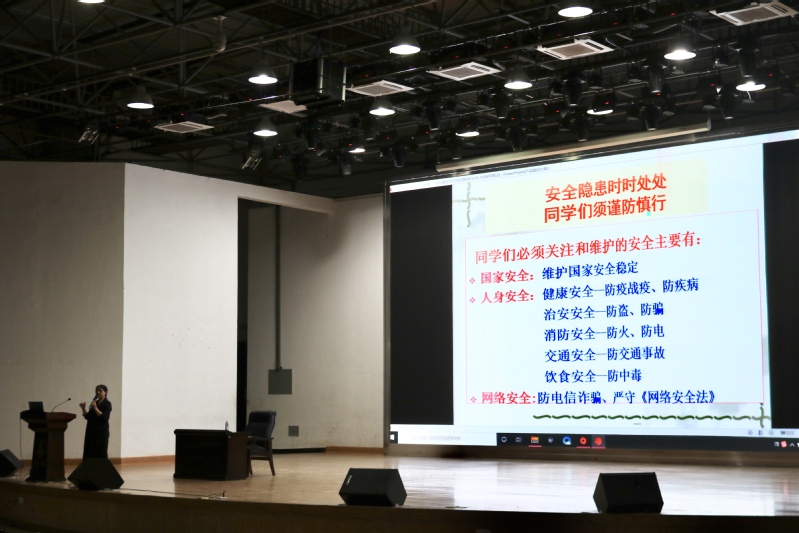 何小霞副书记首先阐述了国家安全的重要性,强化新生树立正确的国家安全意识,自觉维护国家安全稳定。随后围绕消防安全、交通安全、饮食安全、电信诈骗、网贷传销等方面,结合具体实例,向新生们详细讲解了这些案件的隐患性、危害性。并为新生们具体介绍了面对危害时的正确处理办法,冷静应对、及时报案、提供线索、积极配合。