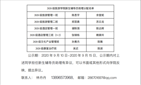 根据武院旅院学[2020]9号《关于选聘旅游学院2020级新生辅导员助理的通知》,2020年9月10日晚,旅游学院学工科科长林平先老师、2020级新生辅导员林丹丹老师、旅游学院分团委副书记陈瑶同学、分团委学生会副主席许美兰同学面试了本次参加选聘的34名同学。经过简历筛选与面试两轮,现公布入选人员名单如下: