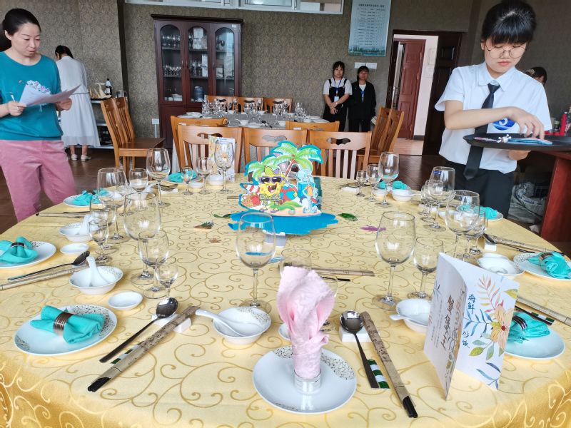 本次比赛邀请马小玲、吴小霞老师担任现场评委,比赛内容包括主题宴会摆台设计、主题讲解等方面。参赛选手激烈比拼,从细节细微之处入手,为在场评委观众带来了一场视觉盛宴。