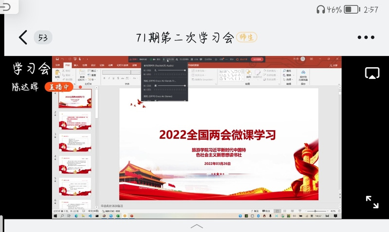 3月26日,旅游学院习近平新时代中国特色社会主义思想读书社通过线上召开“学习两会精神 牢记使命担当”专题学习会。会议由社长陈达晖同学主持,李元芳老师与习近平新时代中国特色社会主义思想读书社71期全体成员参加。