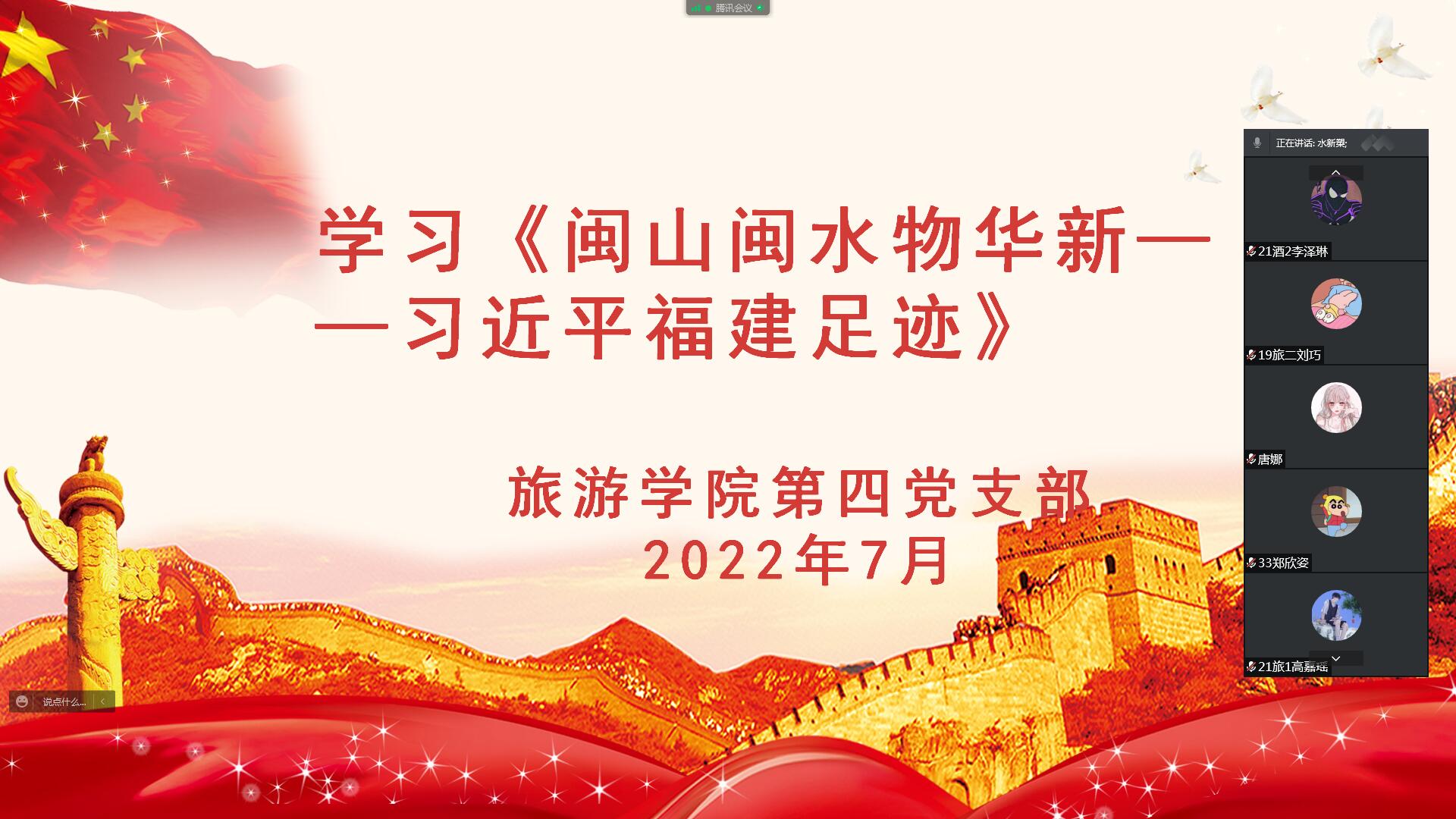 7月2日,旅游学院第四党支部召开党员大会,对《闽山闽水物华新——习近平福建足迹》一书进行专题学习研讨,全体党员通过腾讯会议参加,学习会由支部书记朱明主持。