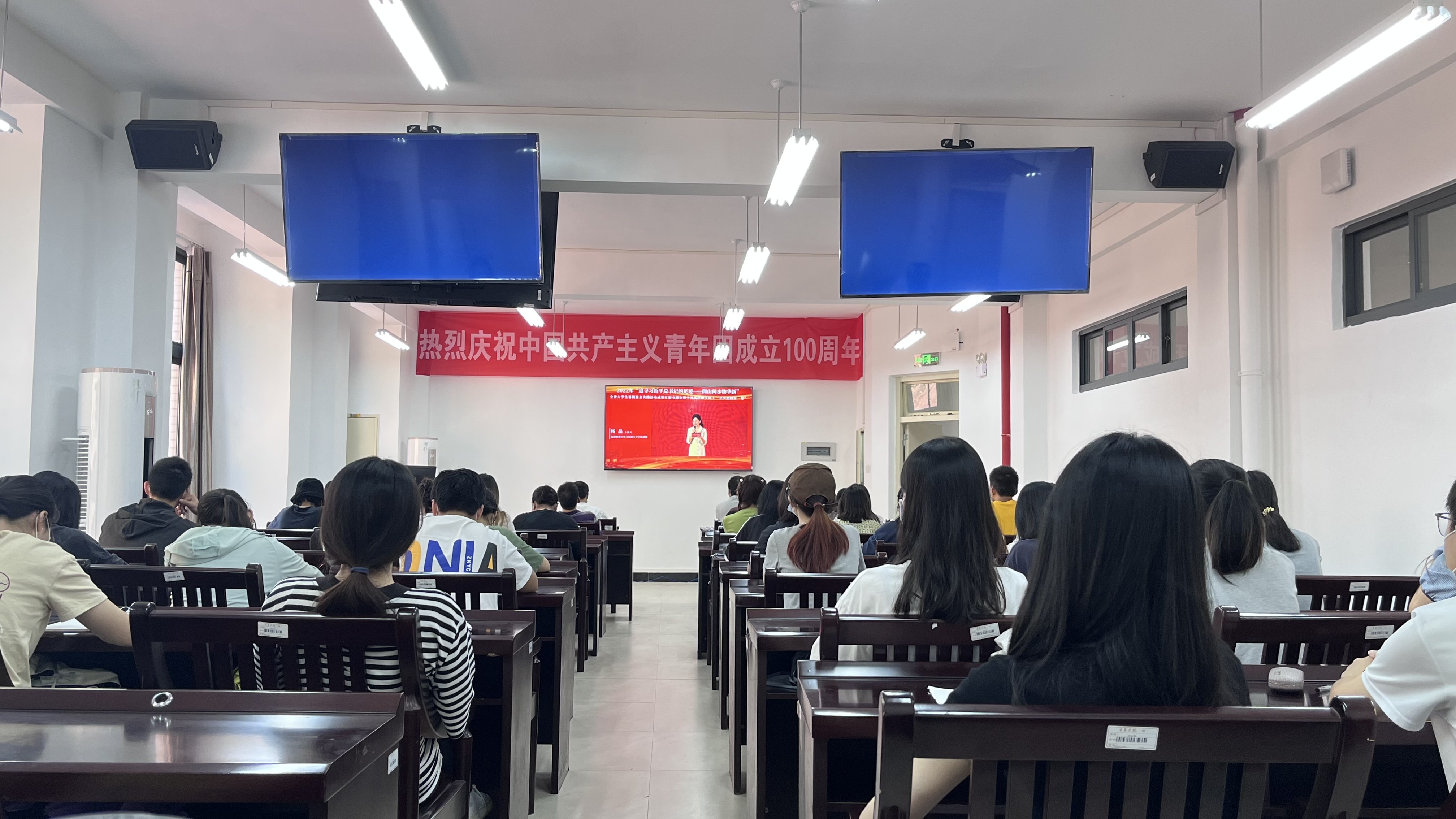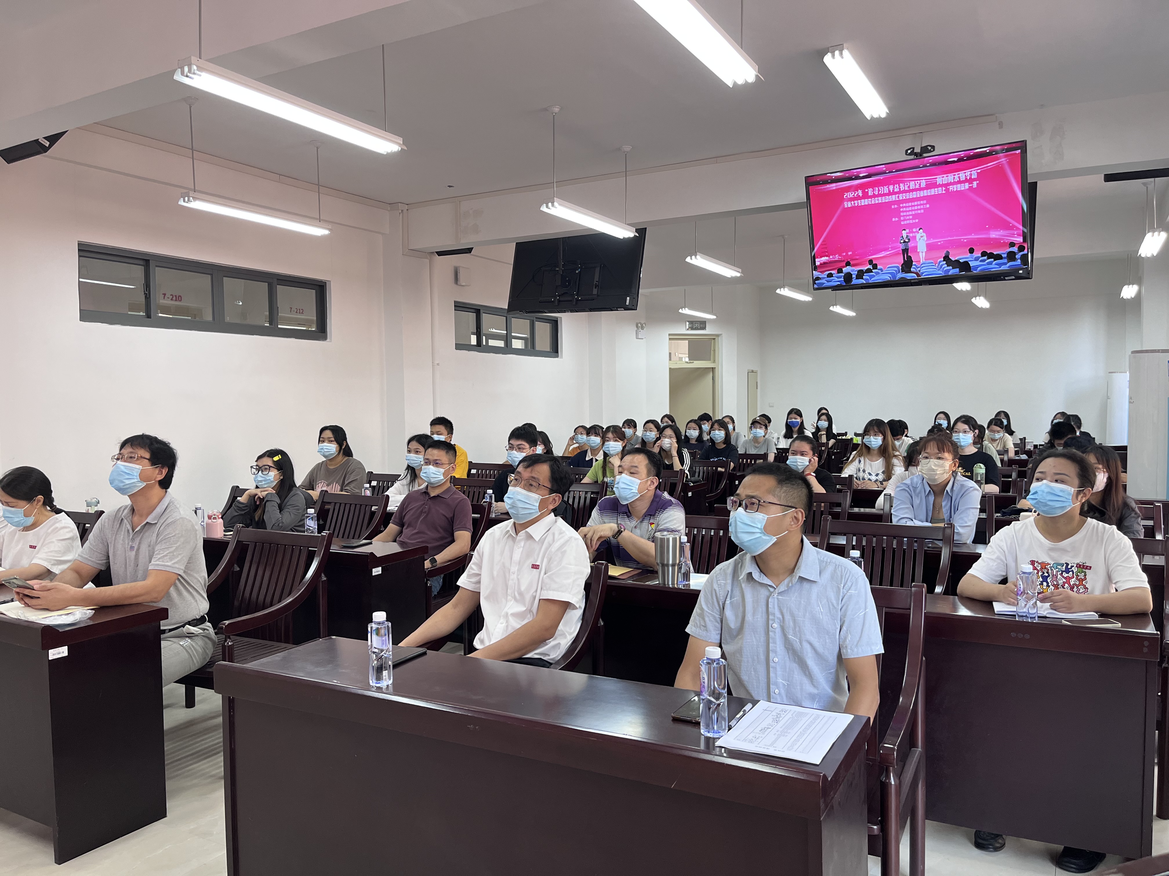 9月18日,由省委宣传部、省委教育工委主办的2022年“追寻习近平总书记的足迹——闽山闽水物华新”全省大学生暑期社会实践活动成果汇报交流会暨全省高校师生同上“开学思政第一课”活动在福建师范大学开讲,我院在同文7-211会议室组织师生代表观看直播。