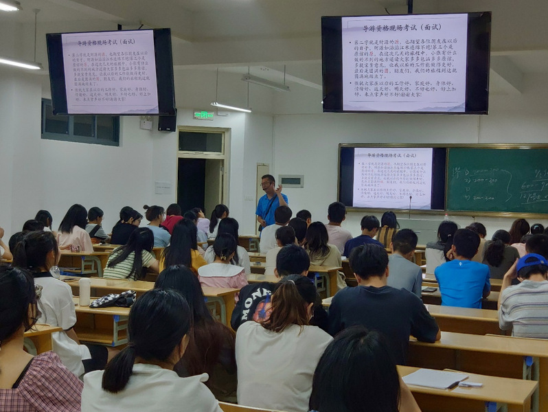 陈礼良老师详细深入地介绍了导游讲解词的讲稿撰写、模拟演讲的要求等,并为同学们做了模拟讲解示范。随后,陈礼良老师与同学们展开交流,回答了同学们对于考试的种种疑问,并期待同学们能够顺利的通过考试,成为新时代的旅游业人才。