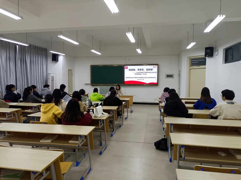 为全面贯彻落实党的二十大精神,深入开展学习贯彻习近平新时代中国特色社会主义思想主题教育,引导广大青年学子坚持读原著、学原文、悟原理,提升思想政治素质与水平,4月25日下午,旅游学院习近平新时代中国特色社会主义思想读书社在同文7-205教室开展学习会,专题学习《习近平新时代中国特色社会主义思想专题摘编》中的总体国家安全观篇目,读书社指导老师李元芳主持会议,第72、73期入党积极分子参加。