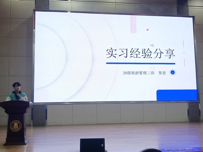 实习交流环节上,2020级旅游管理专业的谢清、黎营和酒店管理专业的李艳鸿三位同学结合自身实习经历,从心态调整、岗位选择、情绪管理、面试技巧、人际交往、自我提升等方面分享经验,引导学弟学妹们调整好心态、积极面对实习工作。