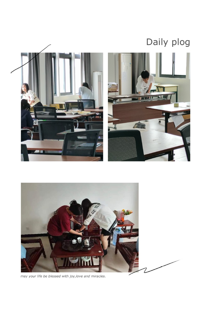 活动伊始由主要负责人陈志垚同学集合10名志愿者对应清洁区域进行分工安排。在活动期间,同学们积极发扬奉献精神,按照分工,各司其职,手拿扫把、麻布、拖把等对对走廊、考研自习室、会议室等区域进行了全面的大扫除,并对教室课桌椅进行规整。