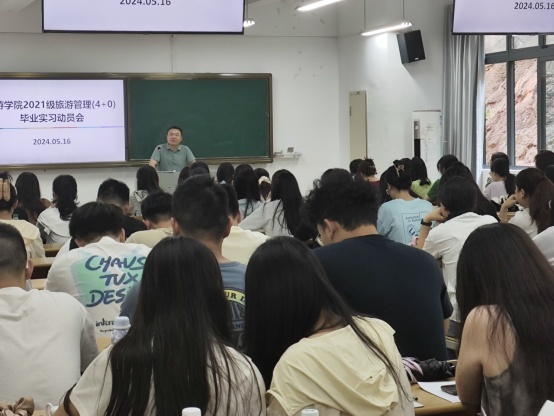 2024年5月16日,旅游学院2021级旅游管理(4+0)实习动员会在同文8-106举行,参加此次动员会的有旅游学院院长熊孝存、专业教师彭夏岁、辅导员朱明老师及2021级旅游管理(4+0)专业全体学生。