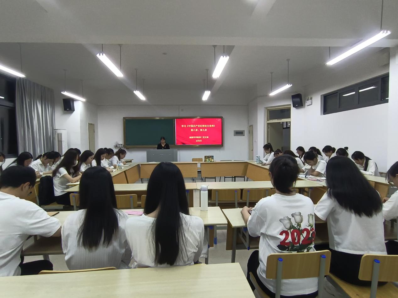 为进一步推动支部党员“学纪、知纪、明纪、守纪”,6月2日晚,旅游学院第三党支部组织开展《中国共产党纪律处分条例》第八章、第九章的学习,并观看警示教育片,会议由韦爱玉老师主持,支部全体党员参加。