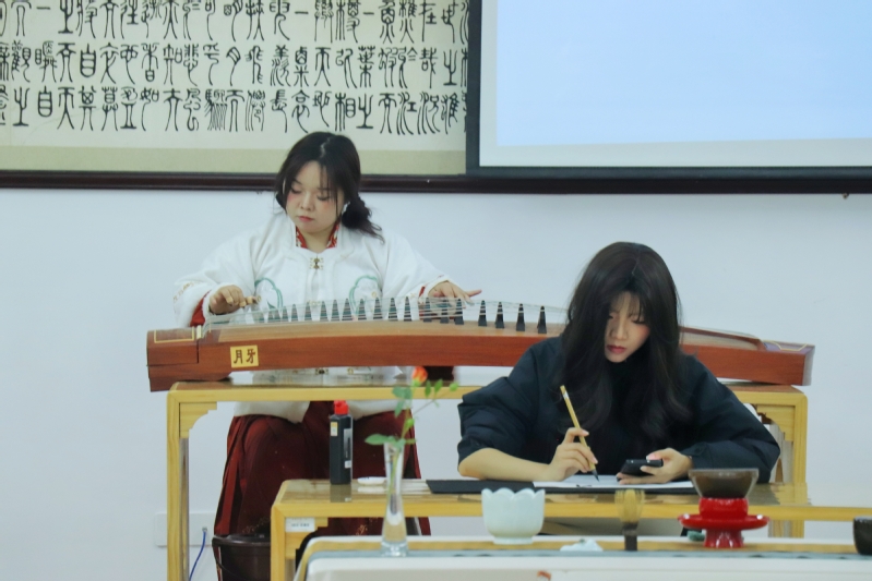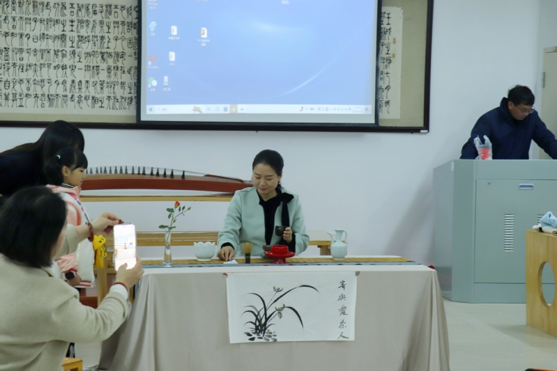 活动开场,屏幕上展示了今年天心村斗茶节志愿活动的照片,生动再现了志愿者们在斗茶节期间的热情参与和无私奉献,传递出茶文化传播中的正能量。紧接着,书法与古筝表演交相辉映,古筝的空灵之音与书法的飘逸笔锋完美融合,为品茶活动增添了一抹浓郁的艺术气息。