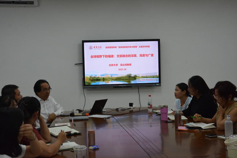为了提升旅游管理专业硕士研究生培养质量,培育学生全球化视野和文旅融合创新思维方式。2025年10月8日下午,旅游学院特邀北京大学城市与环境学院旅游研究与规划中心教授、文化和旅游部“十四五”规划专家委员会委员、游历图书馆创始人吴必虎为2025级旅游管理专业硕士研究生及骨干教师开展“全球视野下的福建:文旅融合的深度、高度与广度”主题的讲座。