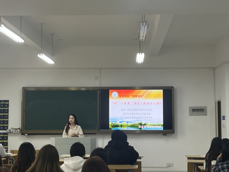 为精准对接2026届毕业生就业需求,帮助酒店管理专业学子打通理论学习与职场实践的“最后一公里”,明确职业发展方向,10月20日,我院邀请2022届毕业生厦门七尚酒店前台主管张心瑜、厦门全总疗养中心销售经理许浩文返校开展职场经验分享会。2026届、2027届酒店管理毕业生参加。