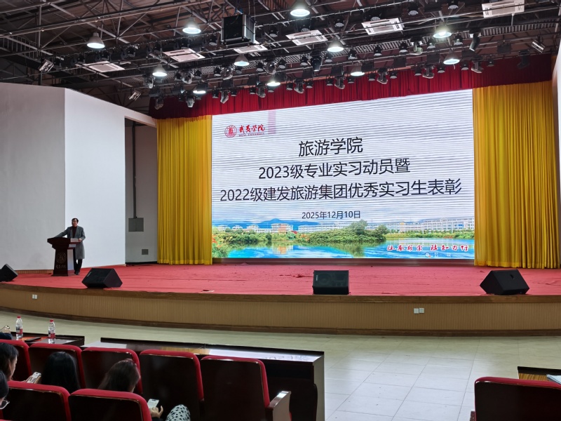 会议第二个环节为2023级专业实习动员。祁少华书记首先强调了专业实习核心目的,希望同学们以此次实习为契机,从认识行业、认识社会、认识自己三个维度深耕细作,实现专业能力与自我认知的双重成长。此外,祁少华书记着重强调实习安全与纪律两大核心要点,要求全体同学恪守相关制度规定,确保岗位操作合规有序。郭伟锋副院长则围绕实习价值与角色转变展开讲话。他指出,此次专业实习携手省内外优质酒店集团及文旅企业提供丰富资源与优质岗位,将为同学们的个人成长、创业发展乃至人生规划带来长远益处,也是完成从学生到职场人角色转变的必经之路,能够有效培养纪律意识、深化对行业的认知,助力同学们明确适配的职业方向。郭伟锋副院长期许全体同学,珍惜实习机会,兼顾实习中的快乐成长与能力提升,平稳、顺利、快乐地完成这段实践之旅。