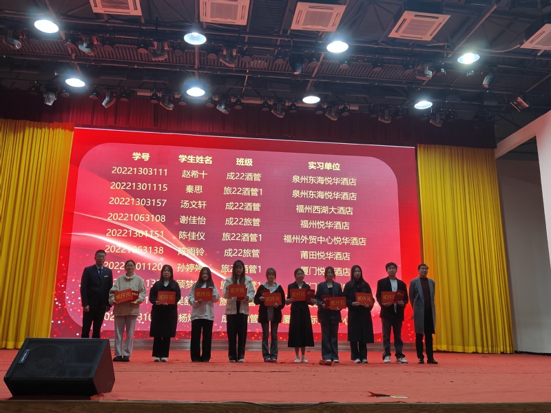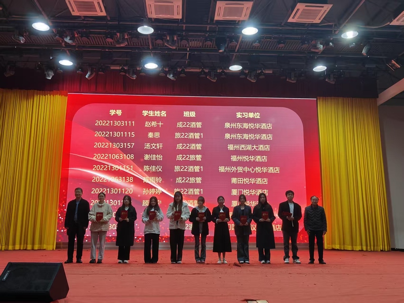 12月10日,我院在大学生活动中心组织召开2023级专业实习动员暨2022级建发旅游集团优秀实习生表彰大会。会议由孙华贞老师主持,旅游学院党委书记祁少华、副院长郭伟锋、海峡成功学院(海外教育学院)副院长魏昌盛、武夷山悦华酒店人力总监邓斌出席,2023级旅游管理、酒店管理(含闽台班)专业全体学生参会。