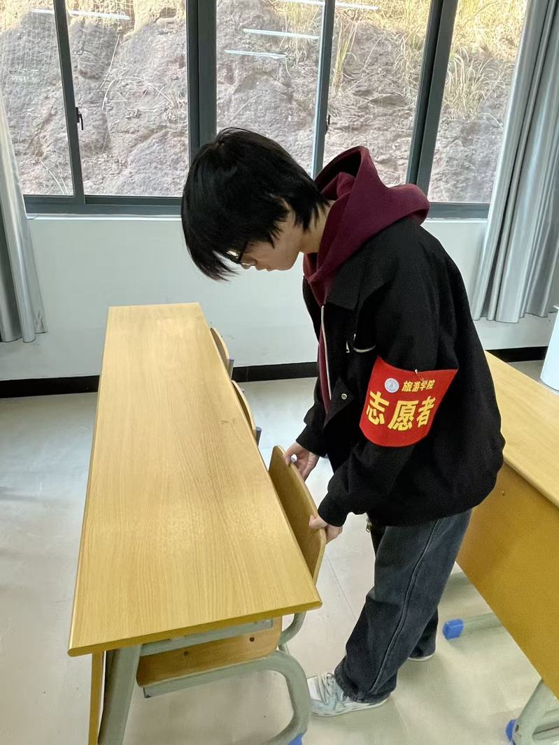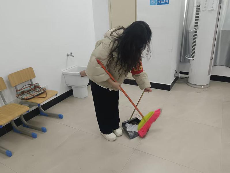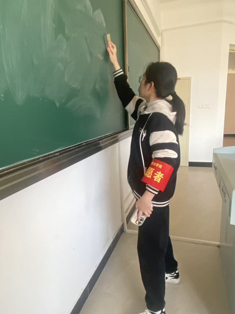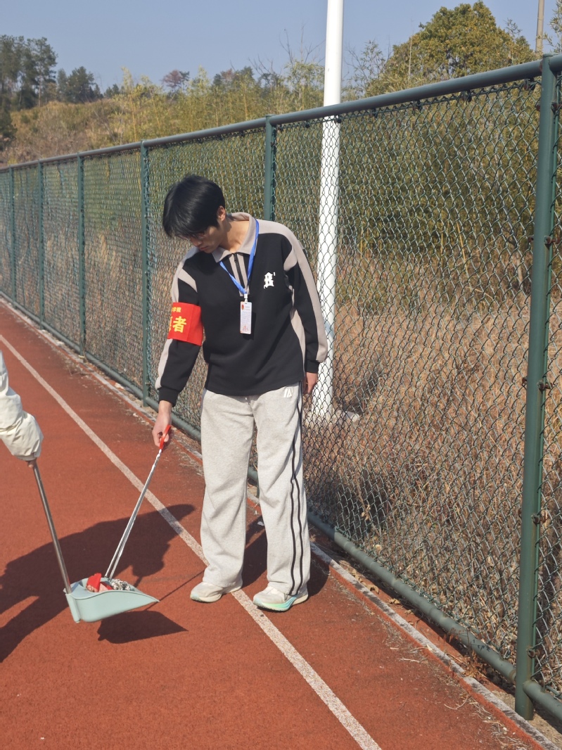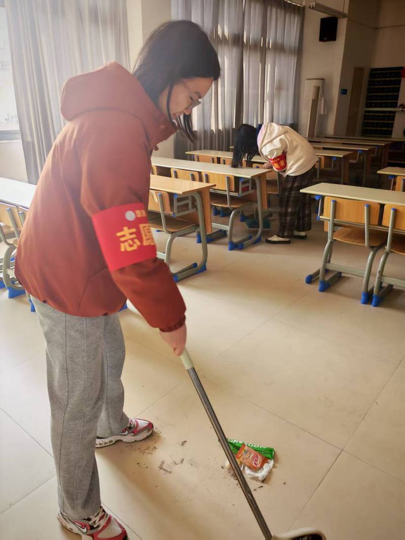 活动中,志愿者们分工明确、协作有序。在教学楼内,大家认真擦拭课桌椅,细致清理窗台积灰,将散落的书籍整理归位;同时逐一清点每间教室的桌椅,并按规范要求摆放整齐。在操场上,志愿者们重点清扫了跑道上的落叶,并仔细捡拾绿化带内的杂物。经过共同努力,教室与操场环境焕然一新,地面干净整洁,整体空间清爽有序,为留校师生及后续教学活动的开展提供了舒适、整洁的环境保障。