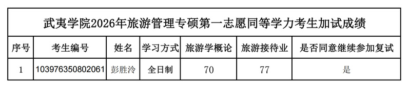 根据教育部关于同等学力考生在研究生复试中加试专业主干课程的规定,结合我院旅游管理专业硕士加试课程的具体实际,现将我院2026年旅游管理专业硕士第一志愿同等学力考生加试课程成绩进行公布,具体如下:
