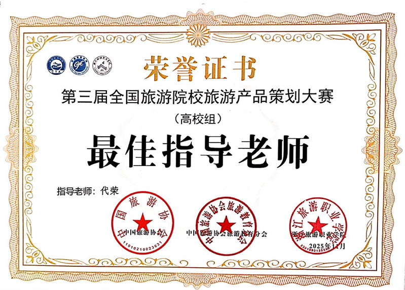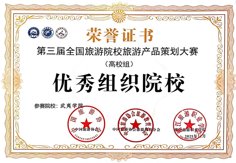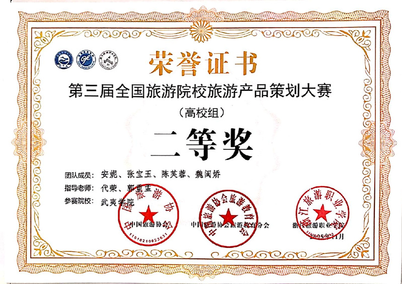 第三届全国旅游院校旅游产品策划大赛决赛于11月20日至23日在浙江舟山圆满举办。由我校马克思主义学院代荣老师、旅游学院郭重猛老师指导,安妮(24级酒店管理)、魏闽娇(24级酒店管理),郭芙蓉(23级食品),张宝玉(海峡23级生物工程)同学组建的“红星逐梦队”不负众望、再传捷报,荣获高校组二等奖的优异成绩,代荣老师荣获“最佳指导老师”奖励,武夷学院荣获“优秀组织院校”。