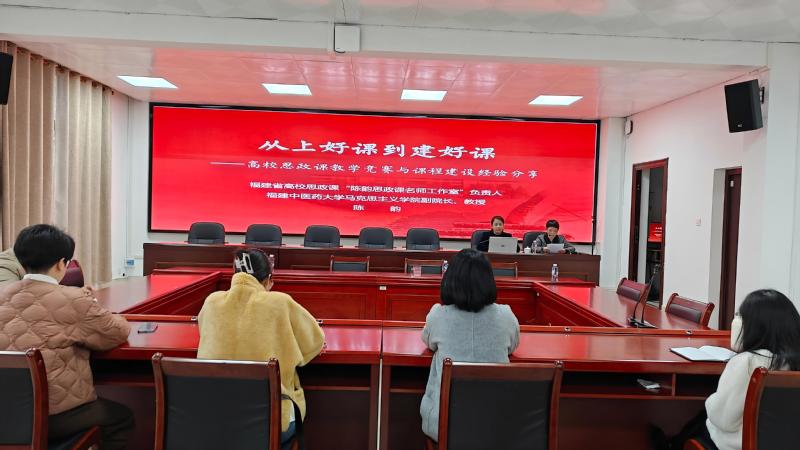 为持续深化思政课改革创新,切实提升教师教学能力与竞赛水平,2025年12月23日,马克思主义学院特邀全国高校思政课教学能手、福建中医药大学马克思主义学院副院长陈韵教授莅临我院,作“从上好课到建好课——高校思政课教学竞赛与课程建设经验分享”专题讲座。讲座由我院陈文副院长主持,全体教师齐聚一堂、认真聆听。