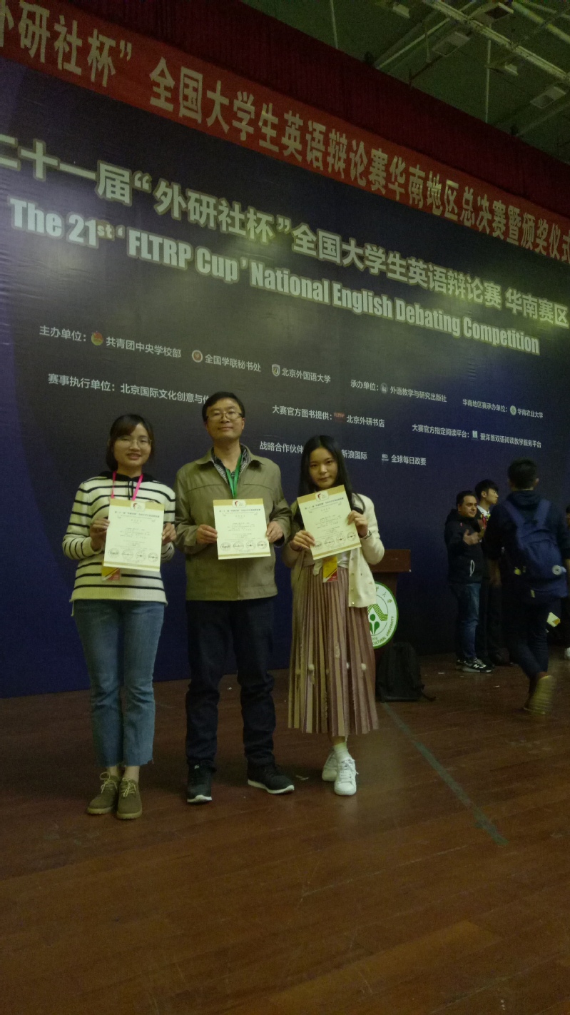 2018年3月23至25日,第二十一届“外研社杯”全国大学生英语辩论赛华南赛区总决赛在华南农业大学顺利举行。我校2016级英语专业吴丽萍和2016级商务英语专业周睿妮两位同学代表学校参赛,并获得华南赛区总决赛三等奖。此次比赛有来自广东、福建、湖南、湖北、广西、云南、贵州、海南等多省的100多所高校派出代表队参加比赛。比赛采用英国议会制,赛前15分钟公布辩题,涉及时政新闻、经济发展、文化交流、教育科技等多方面的最新热点话题,要求选手用英文完成7分钟的辩论演说,对学生的语言能力、思辨能力及临场反应能力均有一定的要求。