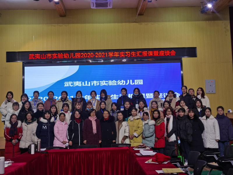 2021年17上午在武夷山实验幼儿园举行了2021届学前教育专业毕业实习生汇报课暨实习座谈交流会。此次活动由武夷山市实验幼儿园举办,武夷山市实验幼儿园领导、各实习生指导教师,我院周玲副院长、吴莉兰老师、带队教师陈琳以及31名实习生等全程参与了活动。