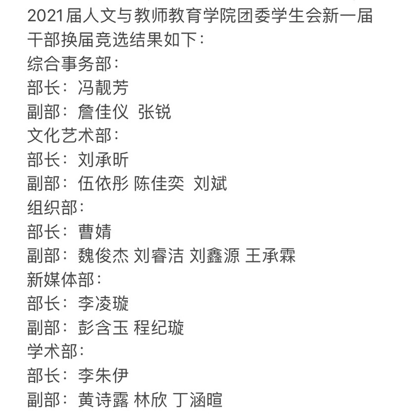 为了促进我院学生会未来工作发展,为我院团委学生会注入新活力,6月27日,我院于瑞2-303举行2021届团委学生会干部竞选。