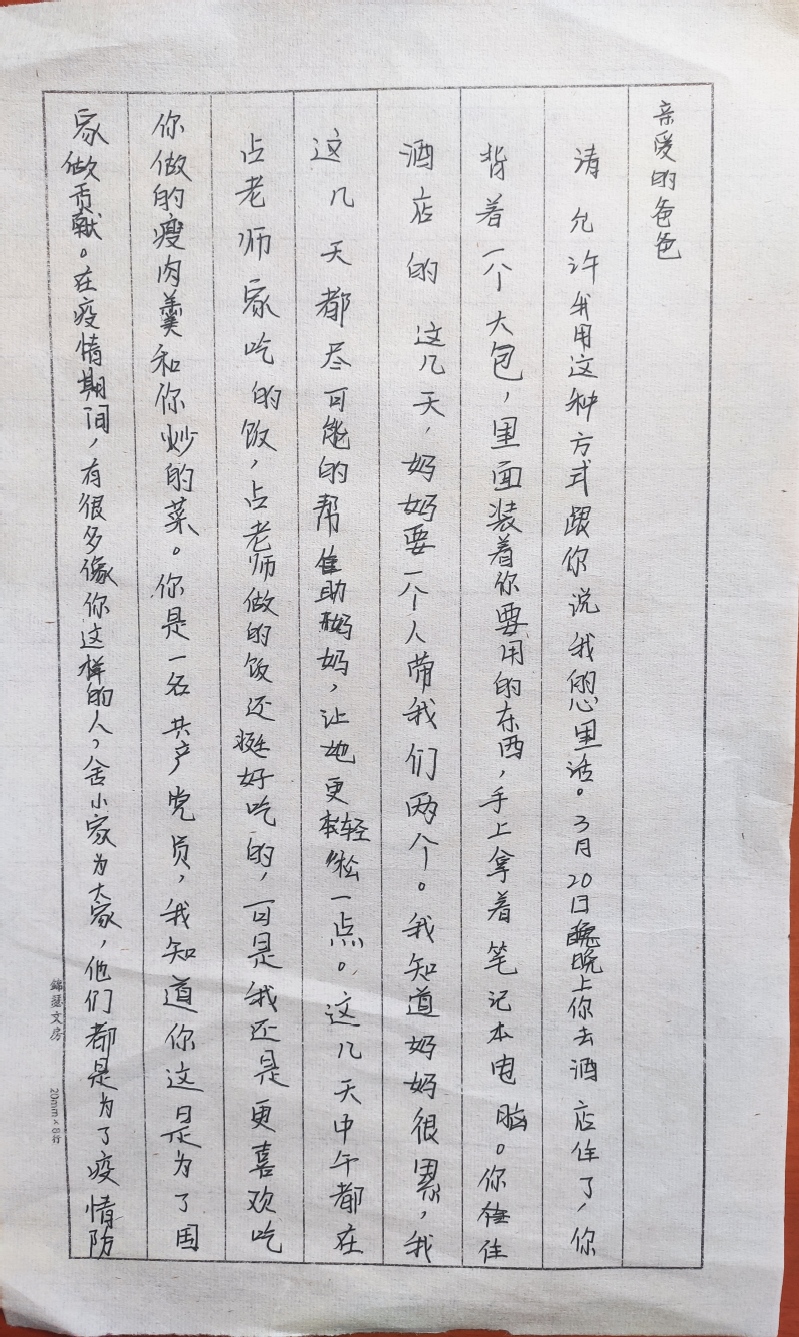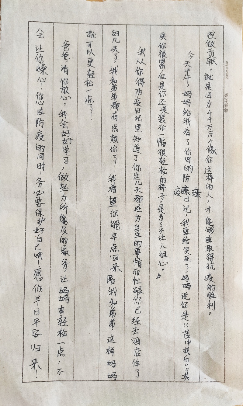 “亲爱的爸爸,请允许我用这种方式跟你说我的心里话。3月20日晚,你去酒店住了,你背着一个大包......务必要保护好自己哦!”这是人文与教师教育学院学生工作科科长宋大伟的女儿给爸爸的一封信。