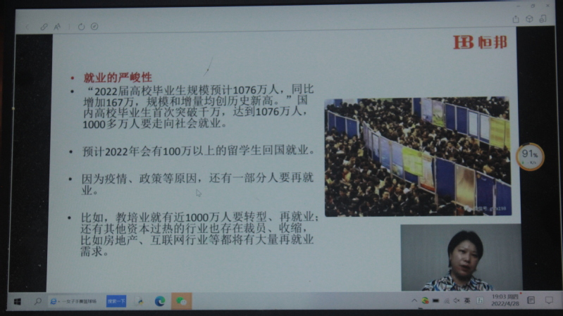 为促进我院毕业生高质量就业,加大就业创业政策宣传力度,4月28日晚我院面向2022届毕业生开展主题为“预见方能遇见更美好的自己”线上职业指导讲座。本次讲座邀请了恒邦孵贸通总经理,福建省外贸实务导师兼武夷学院校董王臻。我院党委副书记陈荣旺、毕业班辅导员及毕业生参加此次线上讲座。