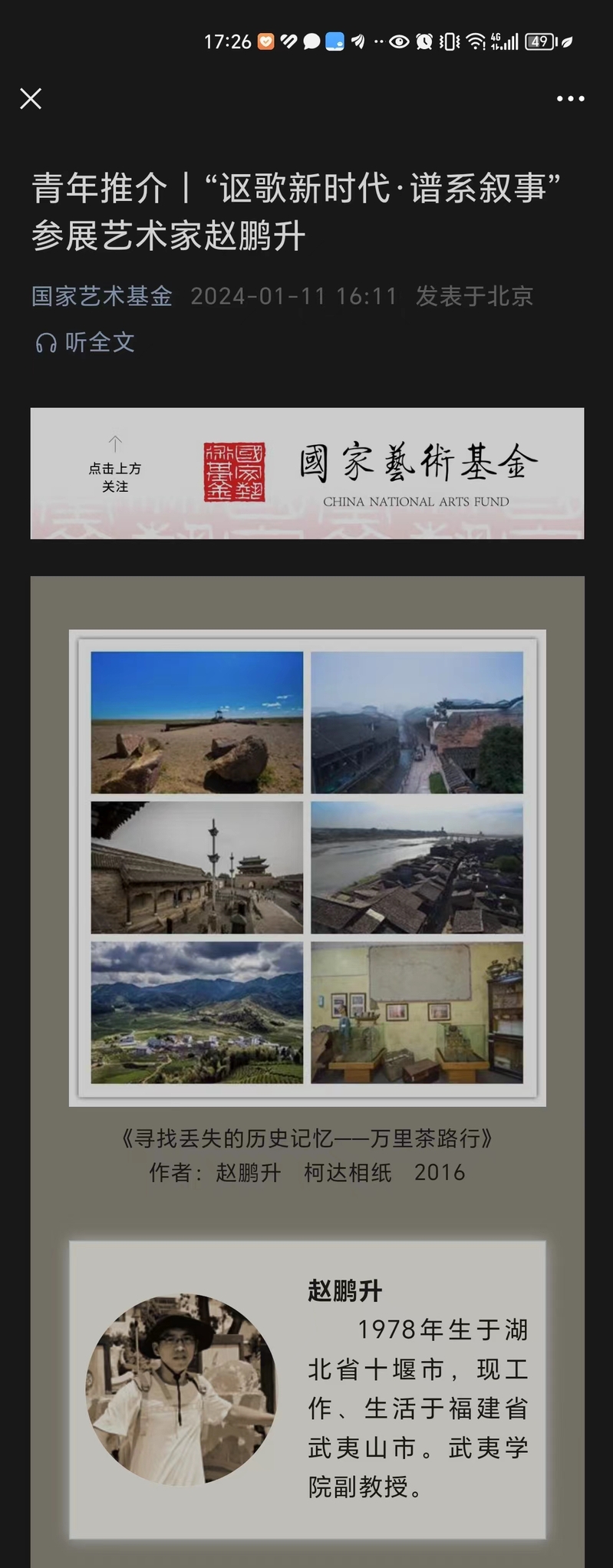 由国家艺术基金管理中心主办的“讴歌新时代”学习宣传贯彻党的二十大精神国家艺术基金资助成果网络展演活动近日开展。我院赵鹏升副教授主持的2016年国家艺术基金摄影创作项目《寻找丢失的历史记忆——万里茶路行》入展。