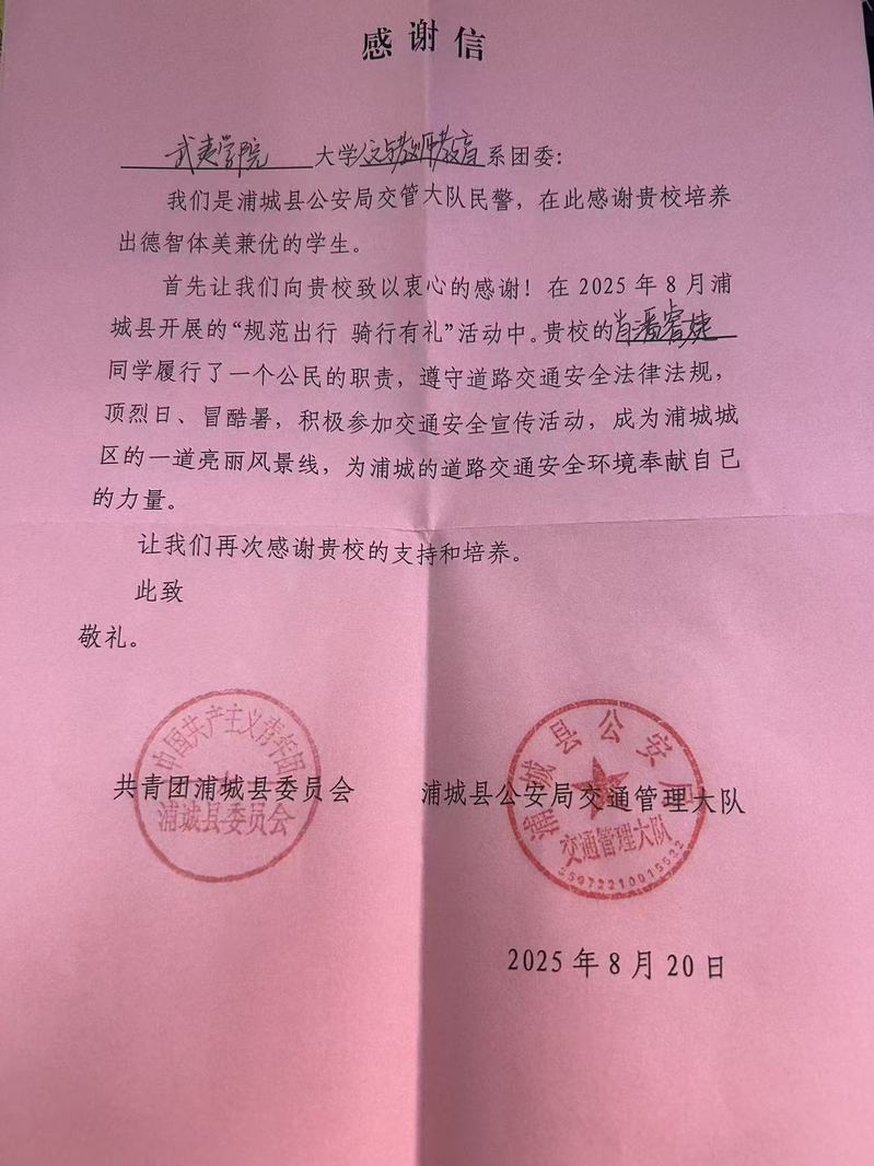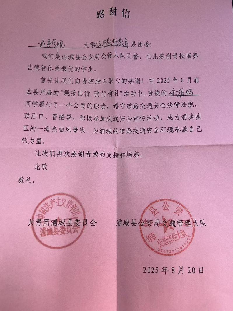 在浦城盛夏的街头,肖潘睿婕与余婧晗两位同学不畏酷暑,化身文明交通的“移动宣传站”。她们以细致耐心的讲解倡导守法出行、文明礼让,用实际行动为城市文明增添了温度与光彩。用青春的坚守为城市文明添上了一抹亮色。她们的专业与热忱赢得了群众的理解与配合,也获得了浦城县公安局交管大队的高度肯定,为共建安全、有序、畅通的城市交通环境贡献了坚实的青春力量。