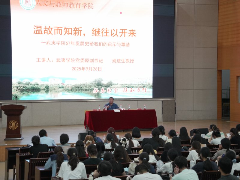 姚进生教授围绕武夷学院67年发展史展开讲解,从1958年南平师范专科学校创办的初心讲起,回顾了学校历经合并组建、迁址停办、复办更名等重要历程——1962年更名南平师范学院承担本科培养任务,1978年经国务院批准复办,2003年陆续迁址武夷山,2007年升格为本科院校,2024年获批硕士学位授予单位的跨越式发展脉络。他结合校史中的奋斗故事,解读了“涵养穷索,致知力行”的校训精神,强调学校从单一师范类专科到多科性硕士授予单位的蜕变,离不开一代代武院人的坚守与拼搏,以此激励新生传承校史基因,筑牢成长根基。
