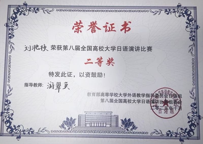 10月18日,第八届全国高校大学日语演讲比赛在大连外国语大学落下帷幕。我校旅游学院2024级学生刘滟桢(指导老师:游翠英)凭借出色表现,荣获二等奖。