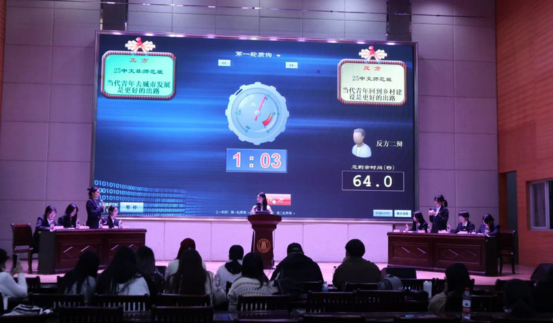 本次辩论赛聚焦乡村振兴、大学生就业等热点话题,围绕“当代青年去城市发展是更好的出路”还是“当代青年回到乡村建设是更好的出路”这一辩题展开激烈交锋。比赛中,正方2025级英语班从城市化进程、职业发展空间、教育资源分配等角度,论证了城市为青年成长提供的广阔平台;反方2024级中文师范班则立足乡村振兴战略、基层实践价值、人生意义实现等层面,阐述返乡发展的时代意义。2025级中文非师范班与2025级中文师范班就同一辩题展开交锋,双方引经据典,从国家政策到个人价值,从时代使命到人生选择,呈现了一场思想深度与辩论技巧完美结合的精彩对决。辩手们在立论、质询、自由辩论等环节展现出扎实的知识储备和敏捷的逻辑思维,现场气氛紧张热烈,观众席不时爆发出热烈掌声。观众提问环节中,同学们就“人才流动与区域平衡发展”“个人理想要融入国家发展需要”等话题与辩手展开深入交流,将现场氛围推向高潮。最终,2025级英语班代表队凭借出色的整体表现荣获一等奖,2025级中文非师范班代表队获得二等奖,2024级中文师范班和2025级中文师范班代表队分别获得三等奖。