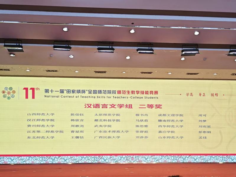 11月30日,第十一届“田家炳杯”全国师范院校师范生教学技能竞赛在浙江师范大学落下帷幕,我院2022级中文师范生陈思雅(指导教师:陈平)发挥出色,荣获汉语言文学组二等奖。