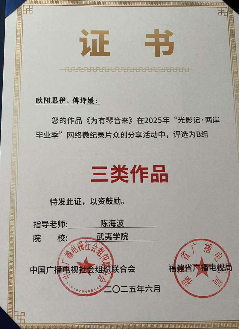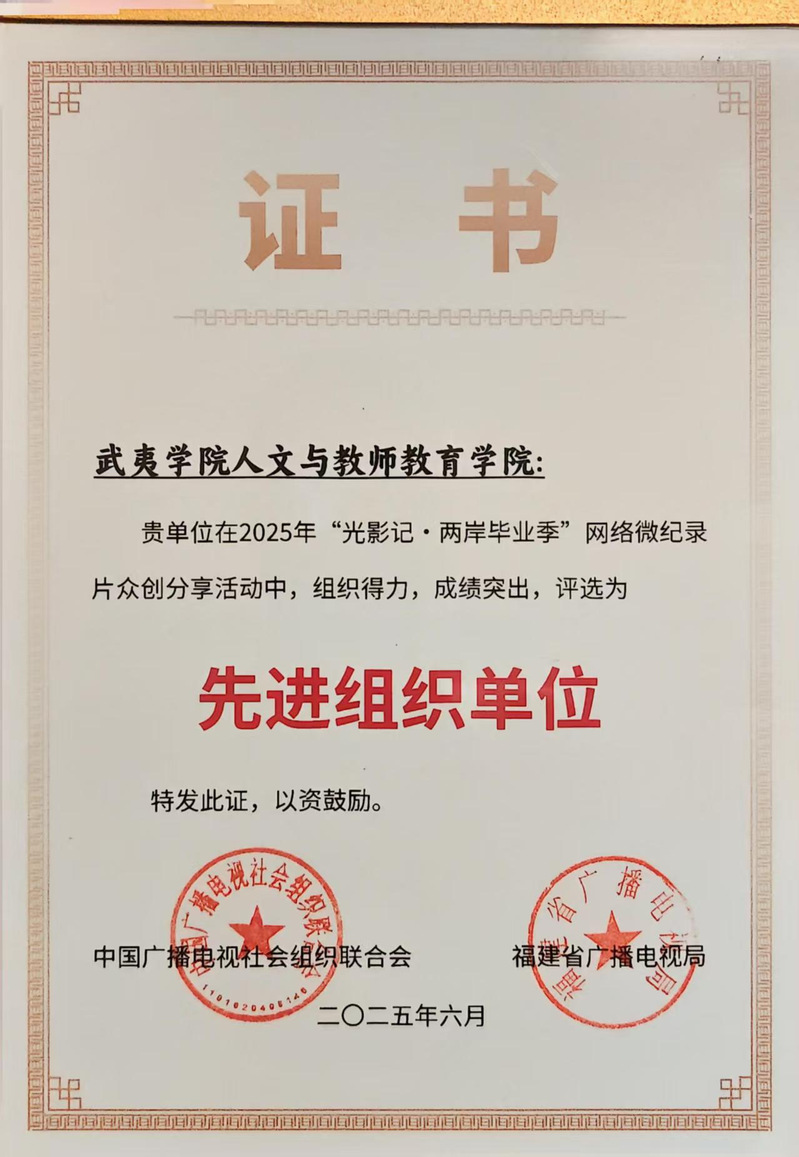 近日,在第十七届海峡论坛·海峡视听季开幕式上,2025年“光影记·两岸毕业季”网络微纪录片众创分享活动评选结果揭晓。我校广播电视编导专业学子斩获A组(社会组)三等奖1项,B组(专业组)1项,潜力奖与优秀奖7项。人文与教师教育学院荣获“先进组织单位”荣誉。