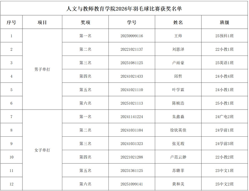 比赛现场,女子组初赛阶段,各小组选手轮番上阵,每场11分制对决紧张激烈,选手们每球必争,每组前二名晋级八强。八强排位赛中,每人连战七场,比分交替上升,按总分数高低决出四强席位。男子组同样从小组循环赛中决出四强。半决赛阶段,男女组四强选手展开三局两胜制循环较量,比分胶着时,选手们沉着调整战术,时而精准吊球调动对手,时而凌厉扣杀打破僵局。决赛现场高潮迭起,女子组决赛中,双方高远球、平抽挡、网前小球轮番上阵,攻防转换之快令场边观众目不暇接;男子组决赛则力量与技巧并重,一次次大力扣杀引爆全场欢呼。季军争夺战同样激烈,选手们全力以赴,为荣誉而战。赛场上,每一次挥拍都凝聚着汗水与专注,落后时不言弃、领先时不松懈,顽强拼搏的精神在每一分争夺中熠熠生辉。经过多轮激烈角逐,24广电2班朱鑫淼同学夺得女子组冠军,男子组25预科1班王帅同学摘得桂冠。