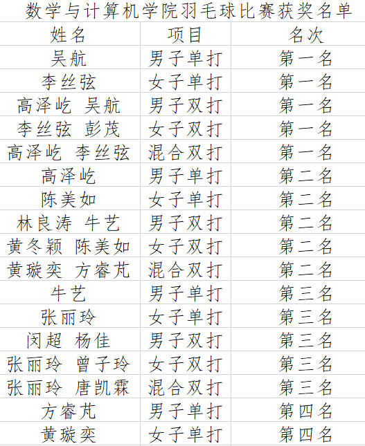 为了激发学生的运动热情,促进校园体育文化的发展,加强同学之间的情感交流。数学与计算机学院团委于5月份在体育馆举办学生羽毛球比赛。本次比赛包含男子单打、女子单打、男子双打、女子双打以及混合双打五项比赛。在比赛的过程中,展现了我院学子团结拼搏、奋发图强的精神风貌。